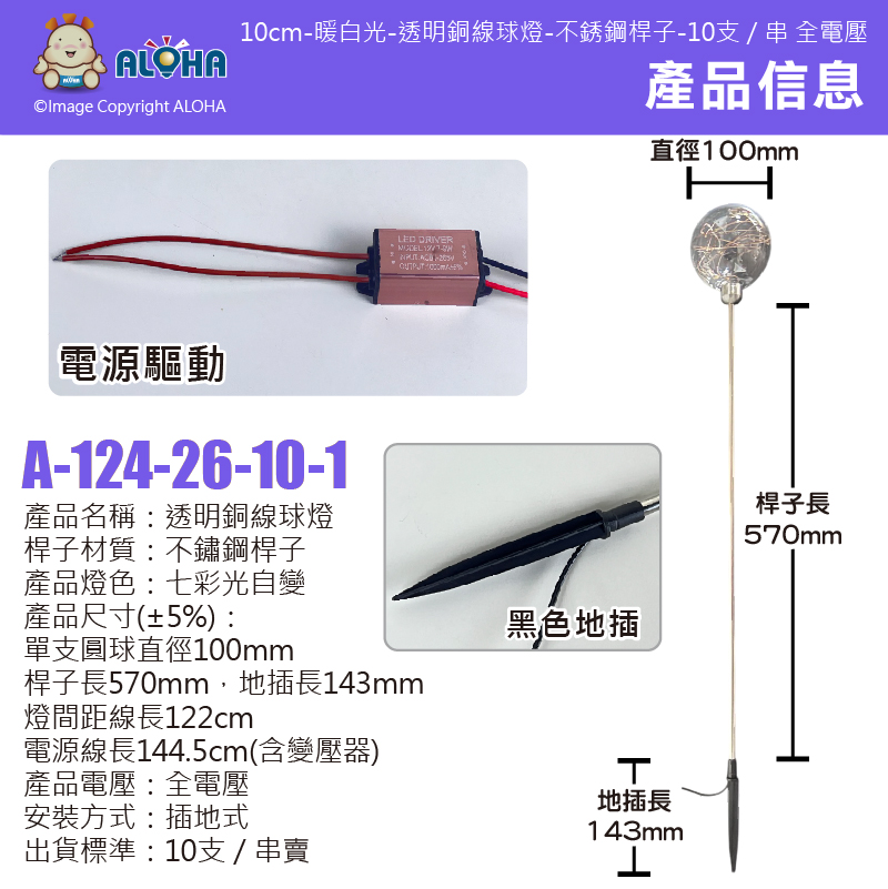 阿囉哈LED總匯_A-124-26-10-1_10cm-七彩光-透明銅線球燈-不銹鋼桿子-10支/串 全電壓 插地燈