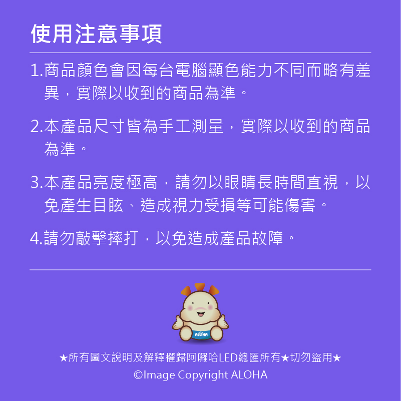 1.商品顏色會因每台電腦顯色能力不同而略有差異,實際以收到的商品為準。 2.本產品尺寸皆為手工測量,實際以收到的商品為準。 3.本產品亮度極高,請勿以眼睛長時間直視,以免產生目眩、造成視力受損等可能傷害。 4.請勿敲擊摔打,以免造成產品故障。