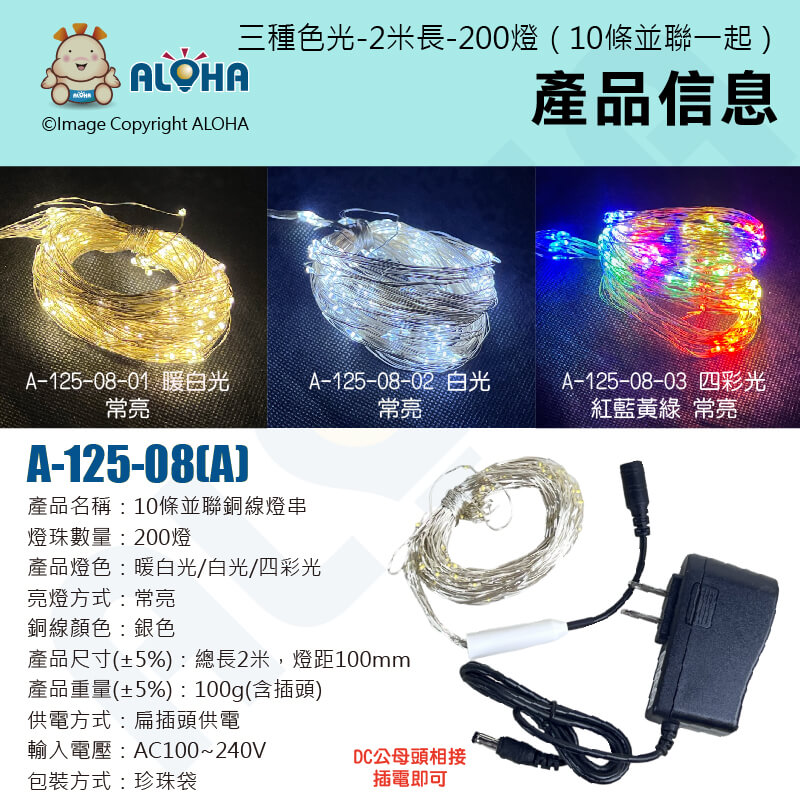 阿囉哈LED總匯_A-125-08(A)_三種色光-扁插電常亮-2米長-200燈(10條並聯一起)-DC3V-銅線燈串-AC100~240V