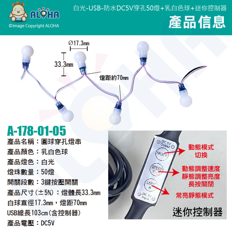 阿囉哈LED總匯_A-178-01-05_白光-USB-防水DC5V穿孔50燈+乳白色球+迷你控制器(可調明暗)/50顆/串賣