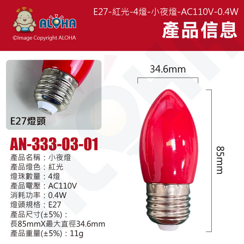 阿囉哈LED總匯_AN-333-03-01_E27-紅光-4燈-小夜燈-AC110V-0.4W 供佛、 財神、 佛堂、 尖形小燈泡