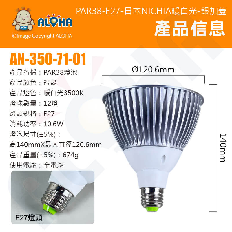 阿囉哈LED總匯_AN-350-71-01 _PAR38-E27-日本NICHIA暖白光-12燈3500K-銀加蓋-全電壓-台灣製造
