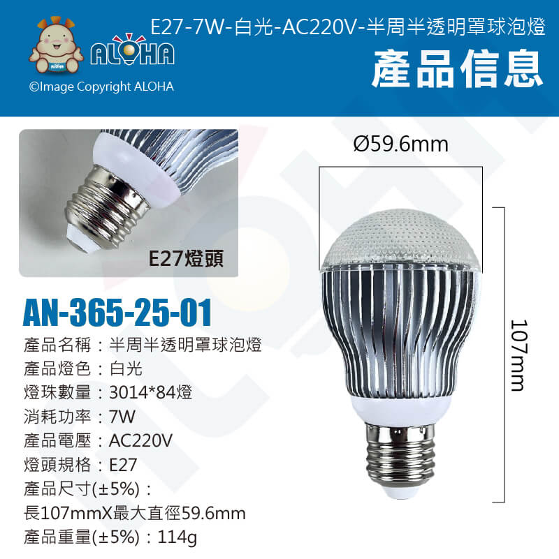 阿囉哈LED總匯_AN-365-25-01_E27-7W-白光-AC220V-半周半透明罩球泡燈-3014*84燈