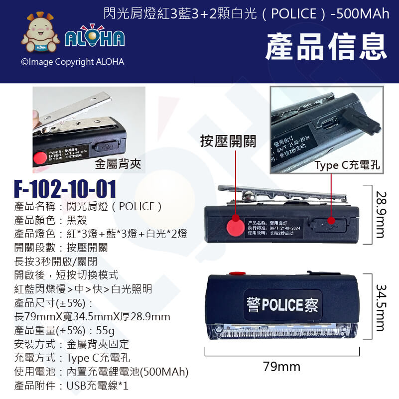 阿囉哈LED總匯_F-102-10-01_閃光肩燈紅3藍3+2顆白光充電(POLICE)附USB充電線-500MAh-JD-QL-28A