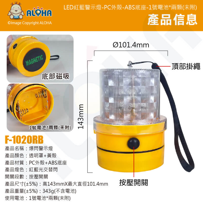 阿囉哈LED總匯_F-1020RB_LED紅藍警示燈-PC外殼-ABS底座-1號電池*兩顆(未附) 底部磁鐵 車頂工程爆閃燈 工程車 交通事故 勤務車 車用工程安全