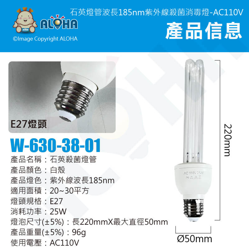 阿囉哈LED總匯_W-630-38-01_25W-E27燈頭-石英燈管波長185nm紫外線殺菌消毒燈-AC110V-無臭氧