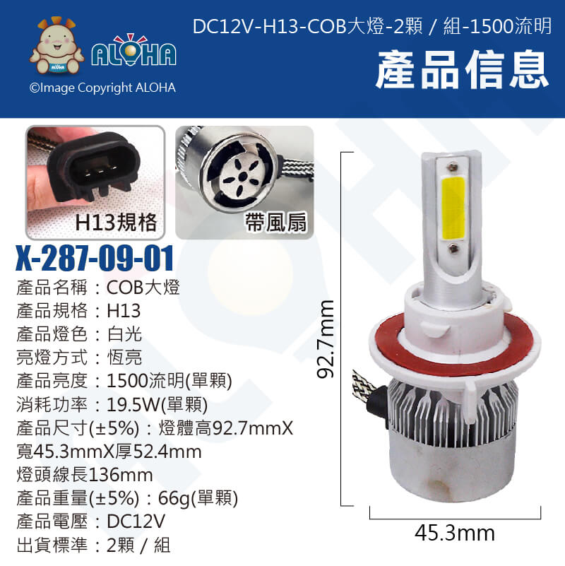 阿囉哈LED總匯_X-287-09-01_DC12V-H13-COB大燈-白光-2顆/組-1500流明-戰鬥版