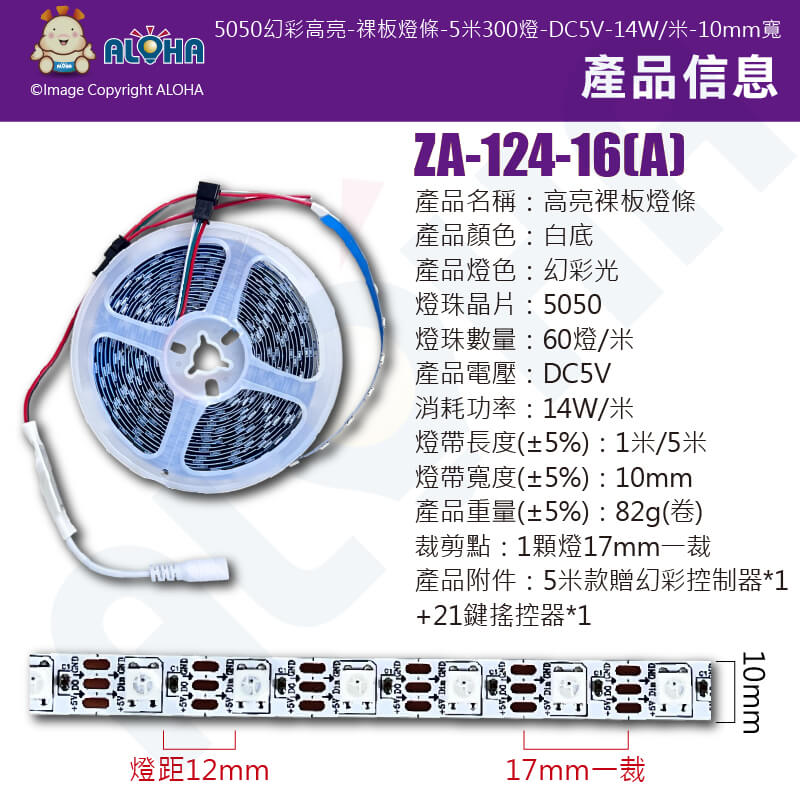阿囉哈LED總匯_ZA-124-16(A)_5050幻彩高亮-祼板內置IC燈條-5米300燈-DC5V-14W/米-10mm寬(附控制)