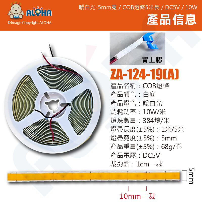 阿囉哈LED總匯_ZA-124-19(A)_暖白光-5mm寬/COB燈條5米長/DC5V/1米/10W/700流明/384顆燈/裸/三安