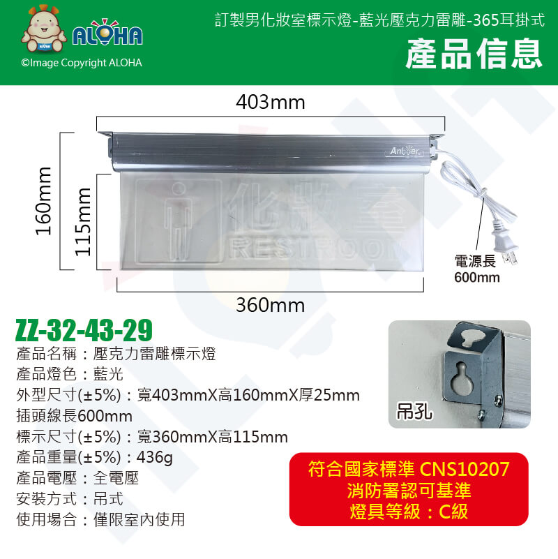 阿囉哈LED總匯_ZZ-32-43-29_訂製男化妝室標示燈-藍光壓克力雷雕-365耳掛式