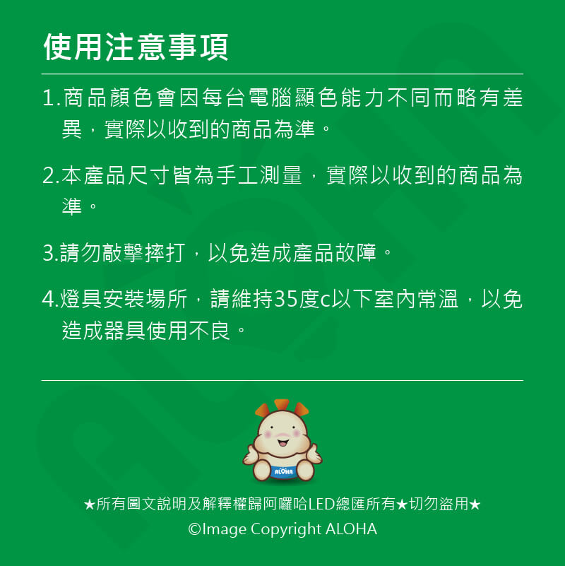 1.商品顏色會因每台電腦顯色能力不同而略有差異,實際以收到的商品為準。 2.本產品尺寸皆為手工測量,實際以收到的商品為準。 3.請勿敲擊摔打,以免造成產品故障。 4.燈具安裝場所,請維持35度c以下室內常溫,以免造成器具使用不良。