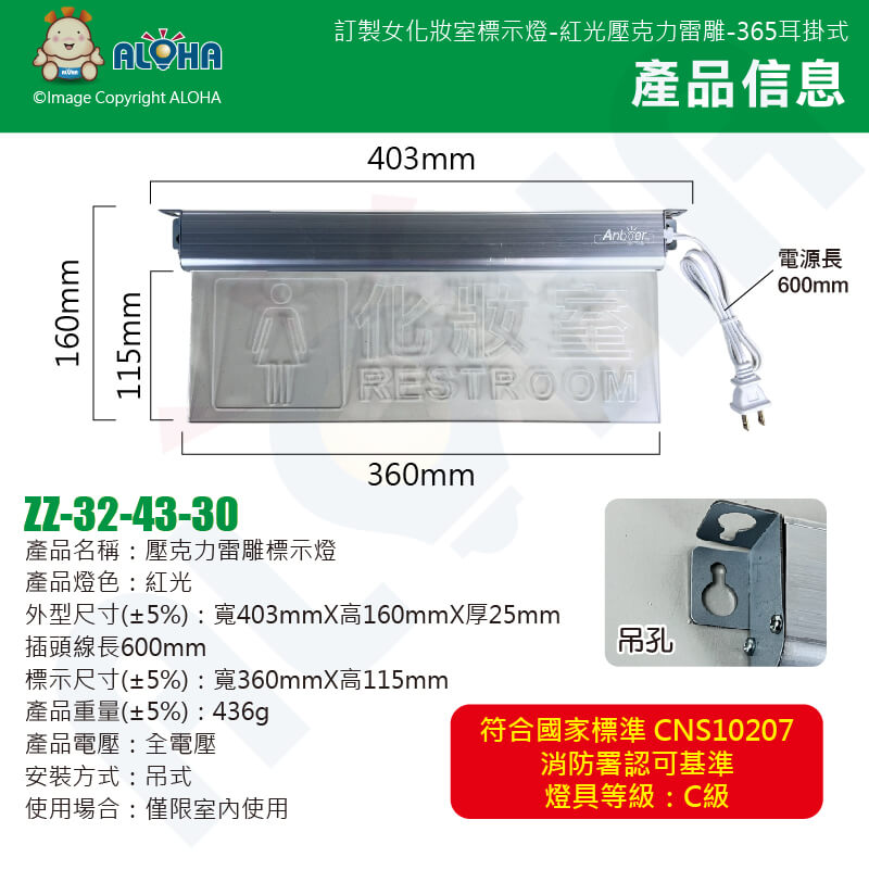 阿囉哈LED總匯_ZZ-32-43-30_訂製女化妝室標示燈-紅光壓克力雷雕-365耳掛式